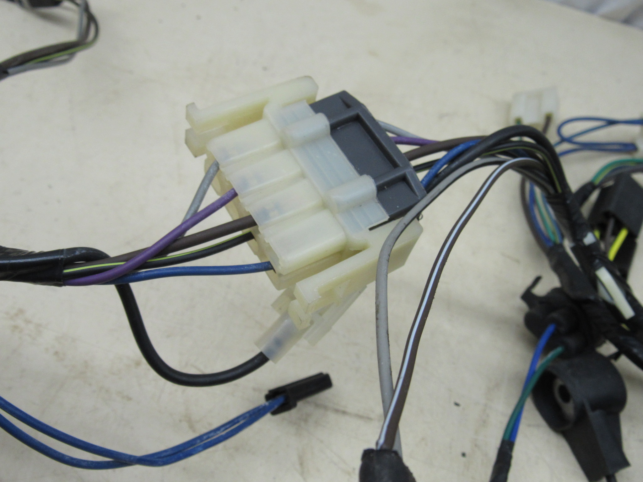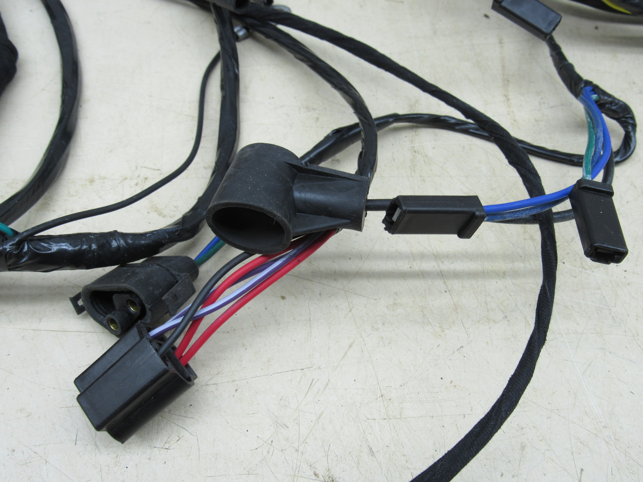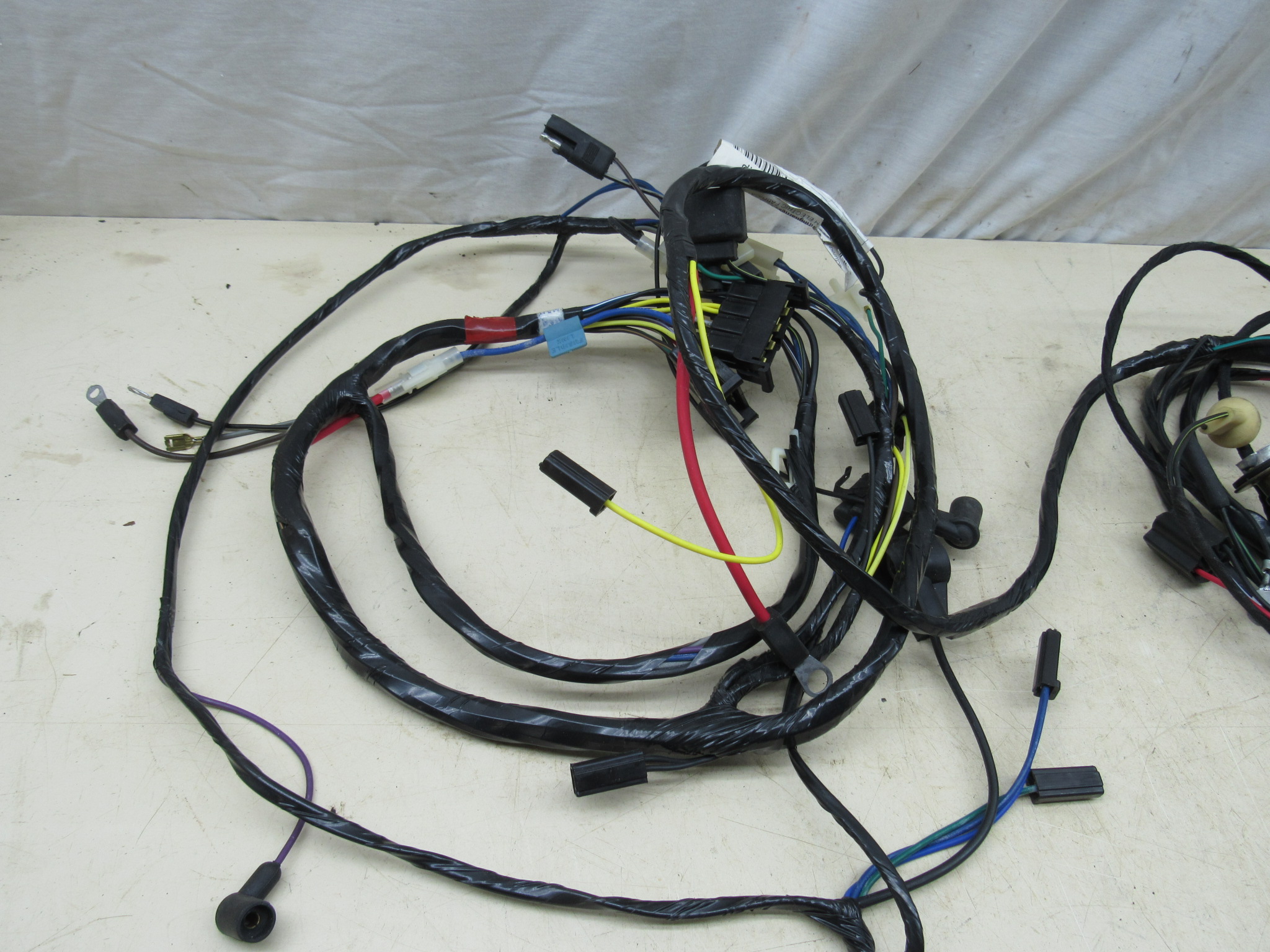 Fits 1974 A body Dodge Dart, Sport, Plymouth Valiant, Duster models with V8 engines built after 10-12-73. This is the front headlamp and engine compartment wiring harness, it is a new reproduction item, and is a complete 2 section harness; forward lamp, and engine, manufactured by M & H Electric Fabricators# 00855 / HU11 sold through Year One. Very good condition, no cuts, splicing, or alterations, it has not been installed, and includes all the connectors, insulators, and terminals; ignition coil, distributor, ignition relay, fusible link, brake warning switch, electronic voltage regulator, electric choke control, horn relay, oil pressure unit, ECU, alternator, ballast resistor, temperature sending unit, horns, windshield washer pump, front headlamp, park lamp sockets, fender side marker lamp, fender mounted turn signal indicator, and firewall bulkhead connectors as intended for models listed, use on these models built after October 12th, 1973. The park lamp connectors / sockets are the 3 prong twist-in type and are integrated into the harness as original equipment. Original Chrysler part# 3764986, see also repro# MA2288. 8-15-2.
