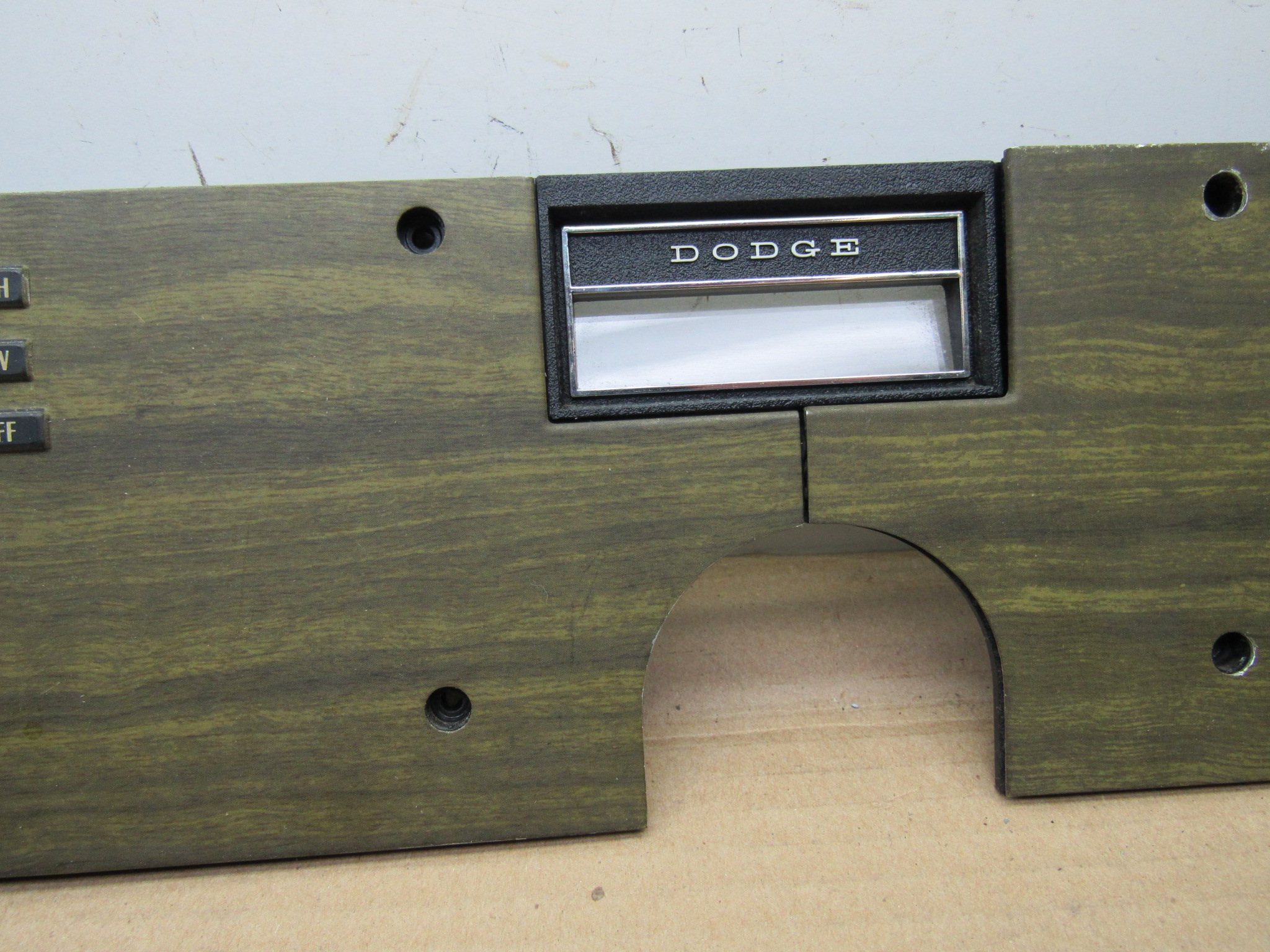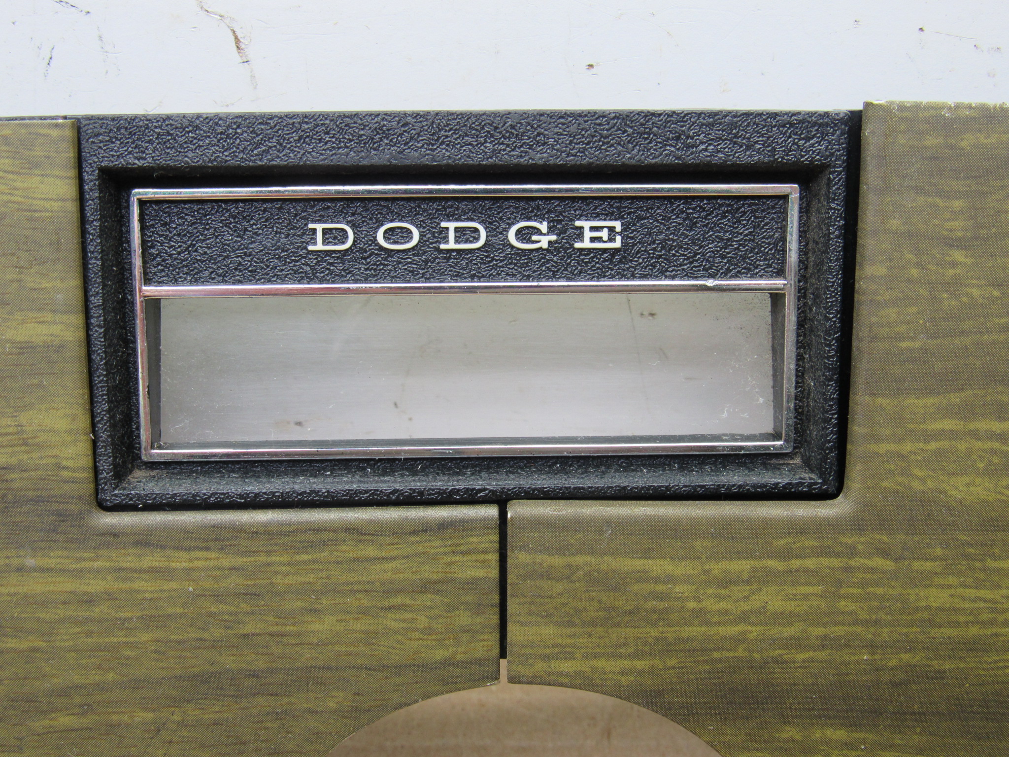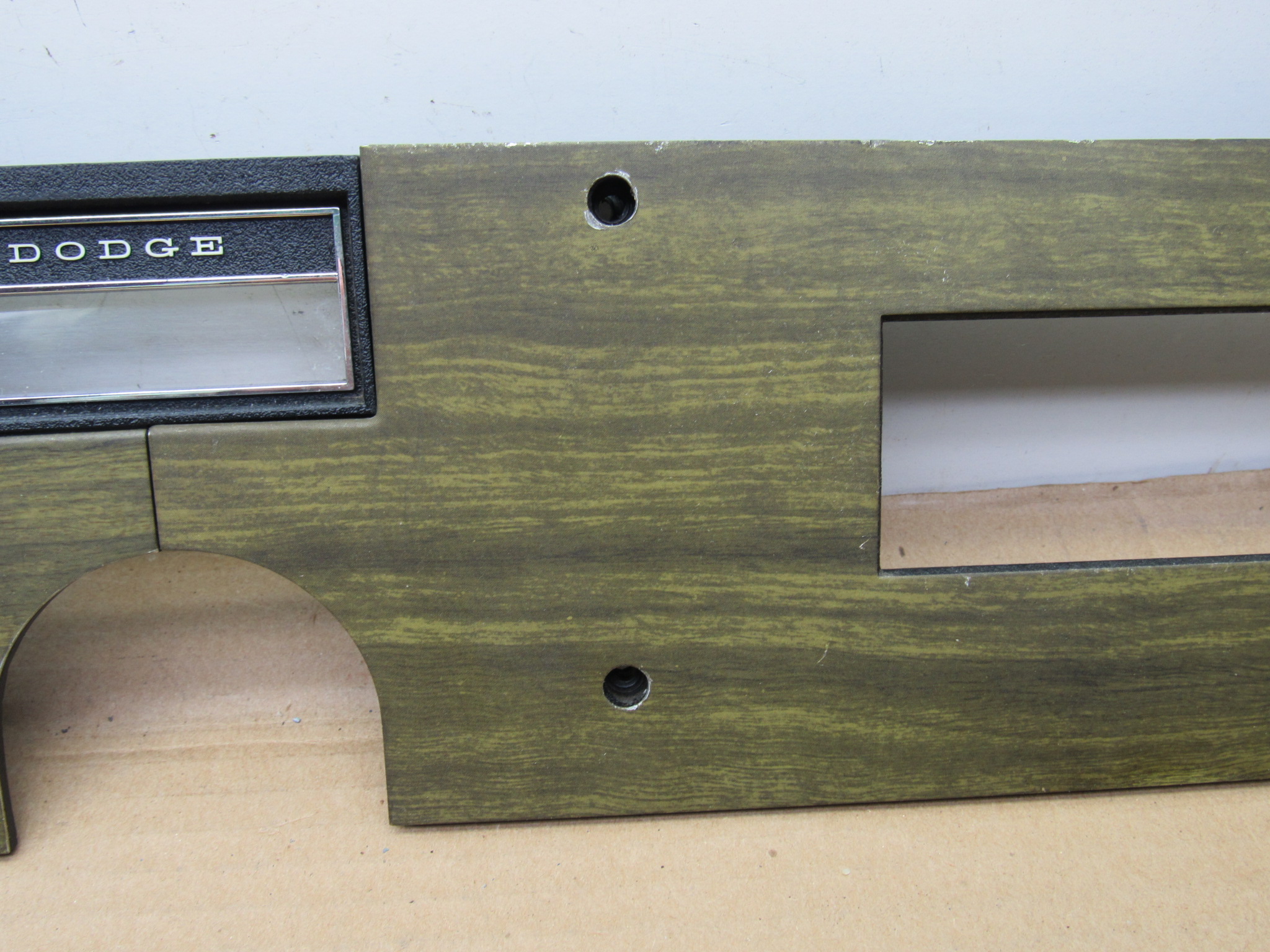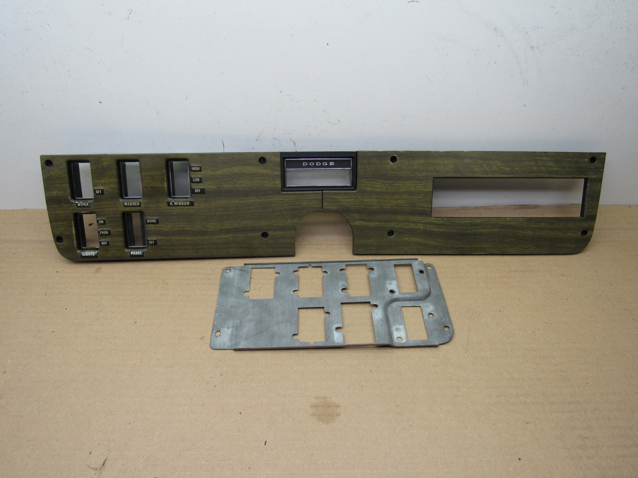 Fits 1970 C body Dodge Polara, Custom, Monaco, 500 models, all 2 and 4 door except convertible and station wagon. This 3 piece package includes the instrument panel radio bezel with overlay / wood grain trim plate, instrument panel switch mounting trim bezel with overlay, and the metal switch trim panel reinforcement plate. These are all used original items, good condition, the plastic is not cracked, and all the mounting provisions are nice. The 2 trim bezels have the wood grain overlay on the front, there is some minor wear from use but overall good condition. The switch bezel has 5 switch provisions; headlamp / lights, washer, wiper, panel dimmer, rear window defogger. It has the “DODGE” lettering in the center where the column shift automatic transmission indicator will mount and mate up to the radio bezel. Use on these models with AM / AM-FM radio, w/o tape player. 23-33-135.