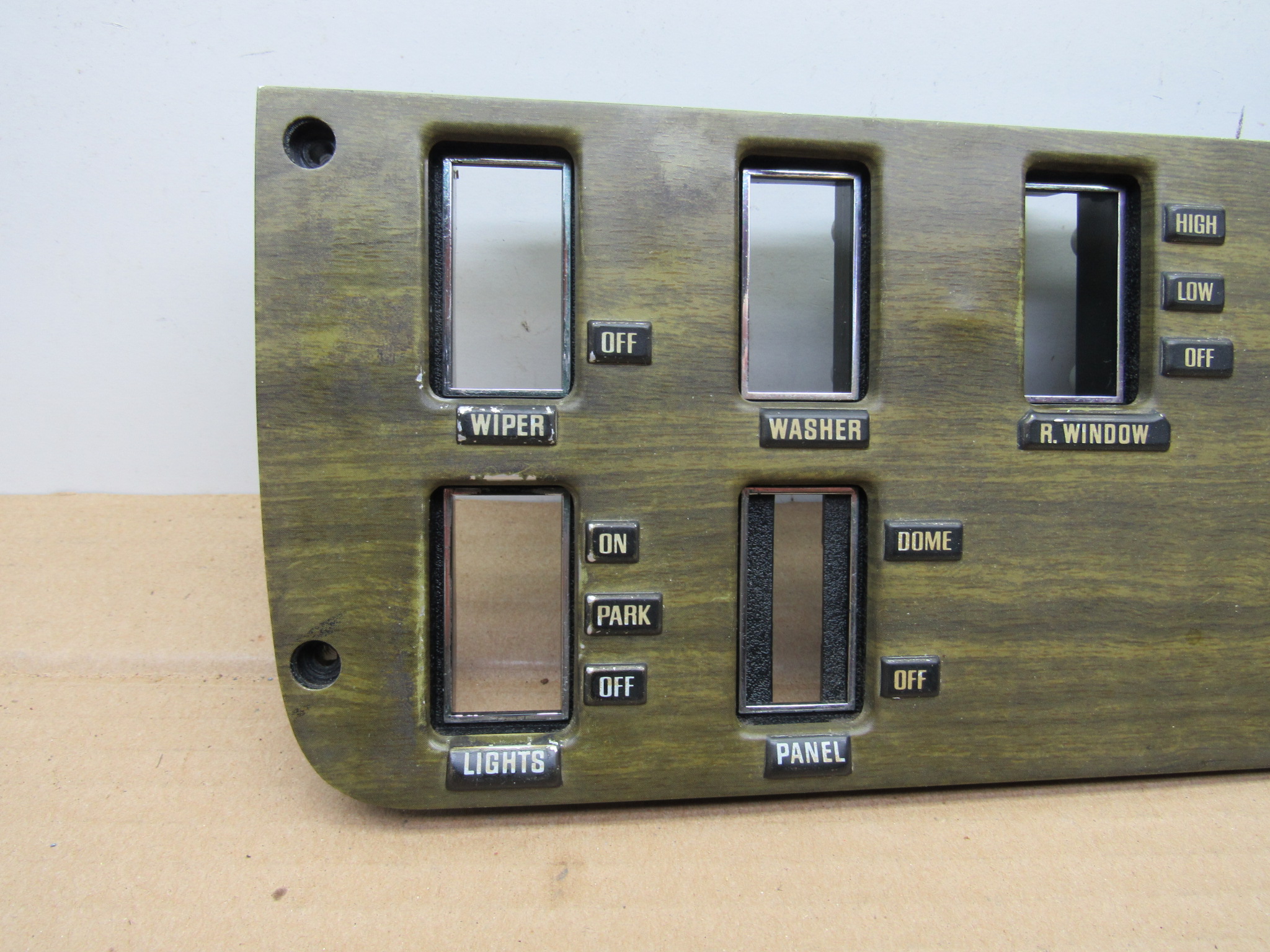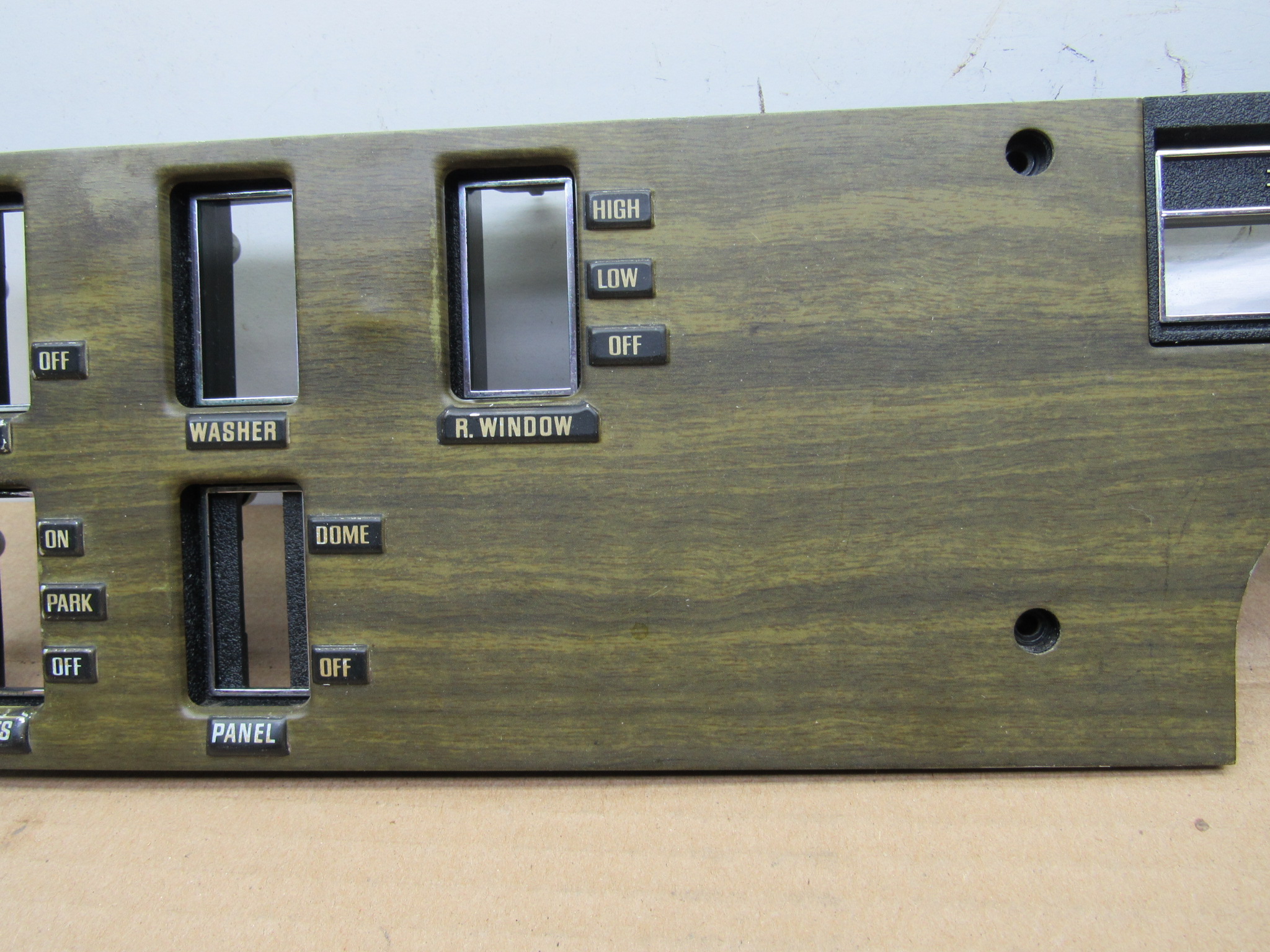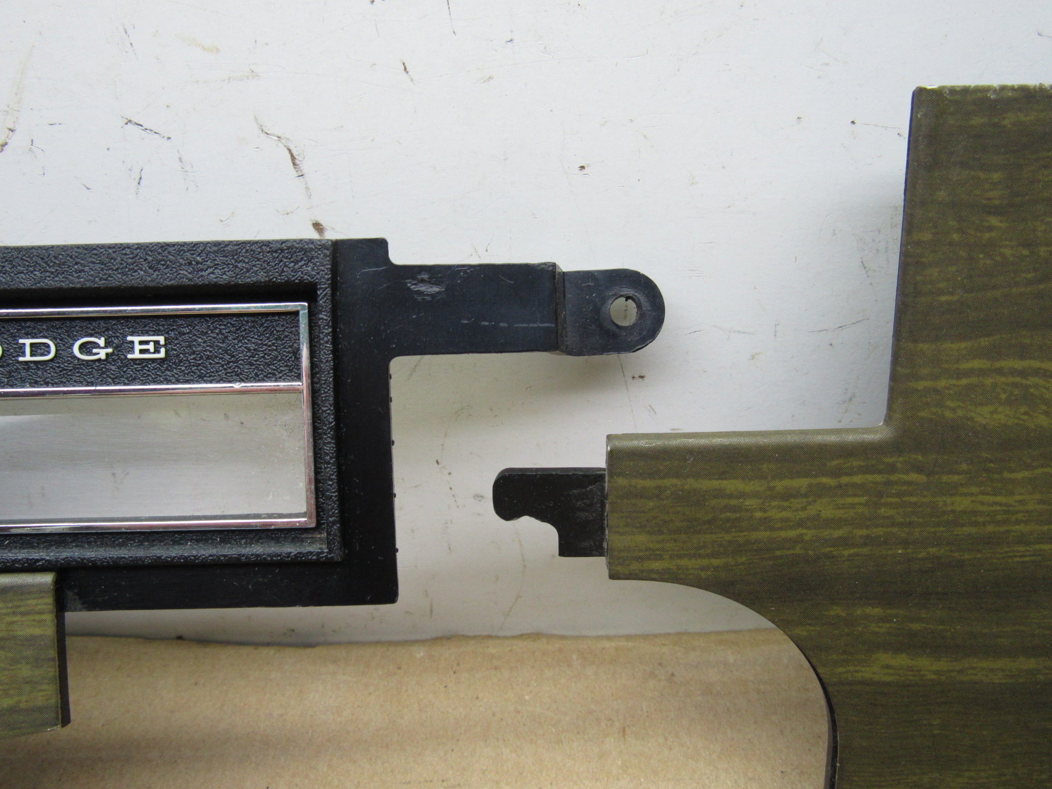 Fits 1970 C body Dodge Polara, Custom, Monaco, 500 models, all 2 and 4 door except convertible and station wagon. This 3 piece package includes the instrument panel radio bezel with overlay / wood grain trim plate, instrument panel switch mounting trim bezel with overlay, and the metal switch trim panel reinforcement plate. These are all used original items, good condition, the plastic is not cracked, and all the mounting provisions are nice. The 2 trim bezels have the wood grain overlay on the front, there is some minor wear from use but overall good condition. The switch bezel has 5 switch provisions; headlamp / lights, washer, wiper, panel dimmer, rear window defogger. It has the “DODGE” lettering in the center where the column shift automatic transmission indicator will mount and mate up to the radio bezel. Use on these models with AM / AM-FM radio, w/o tape player. 23-33-135.