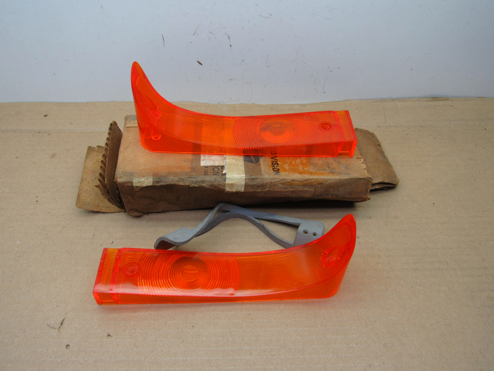 Fits 1967 C body Chrysler Newport, Newport Custom, 300 models. This is a pair, 1 left and 1 right side front park lamp amber lenses, 1 gasket is also included. Very good condition, no chips or cracks. 8-50-334.