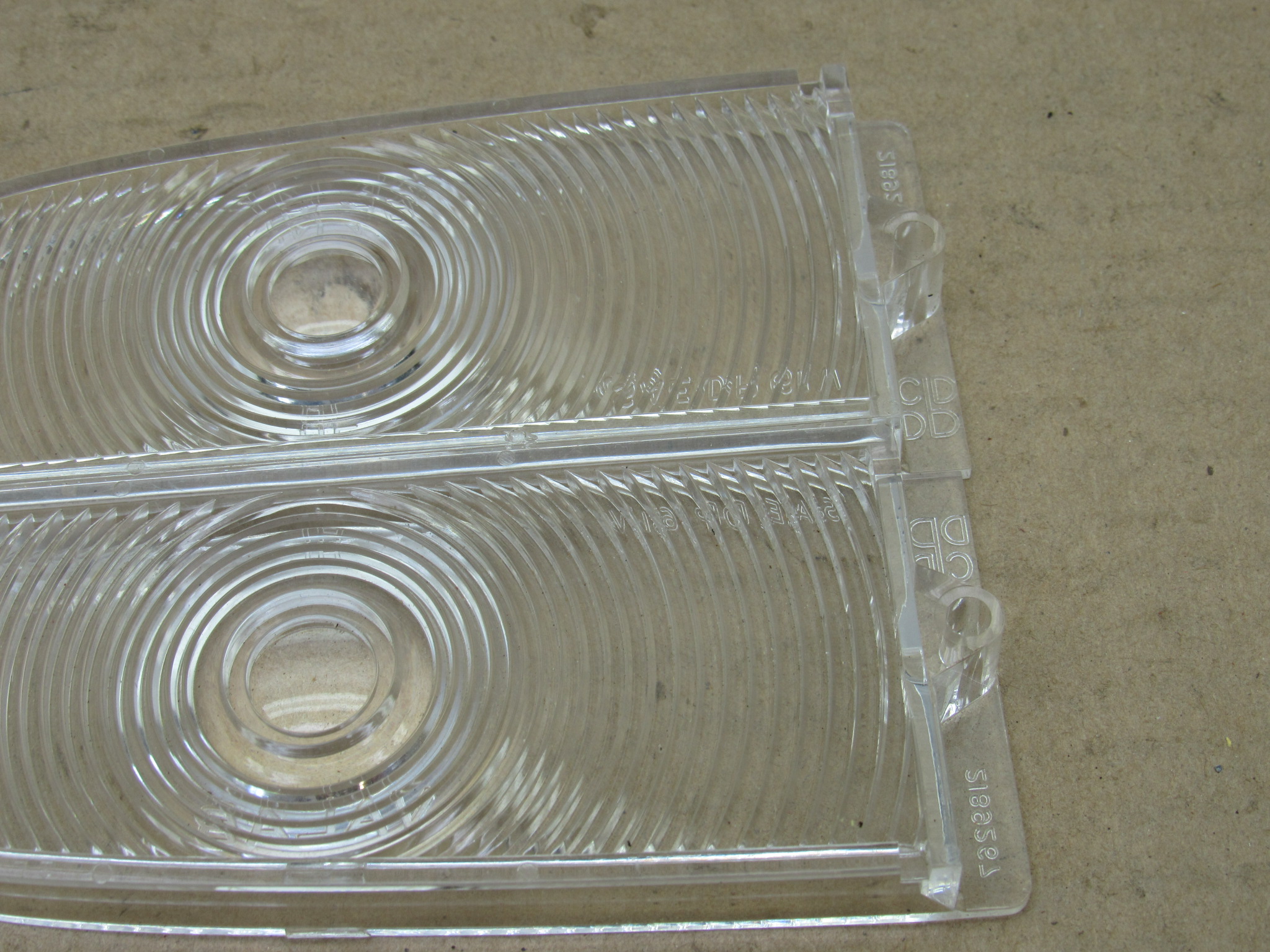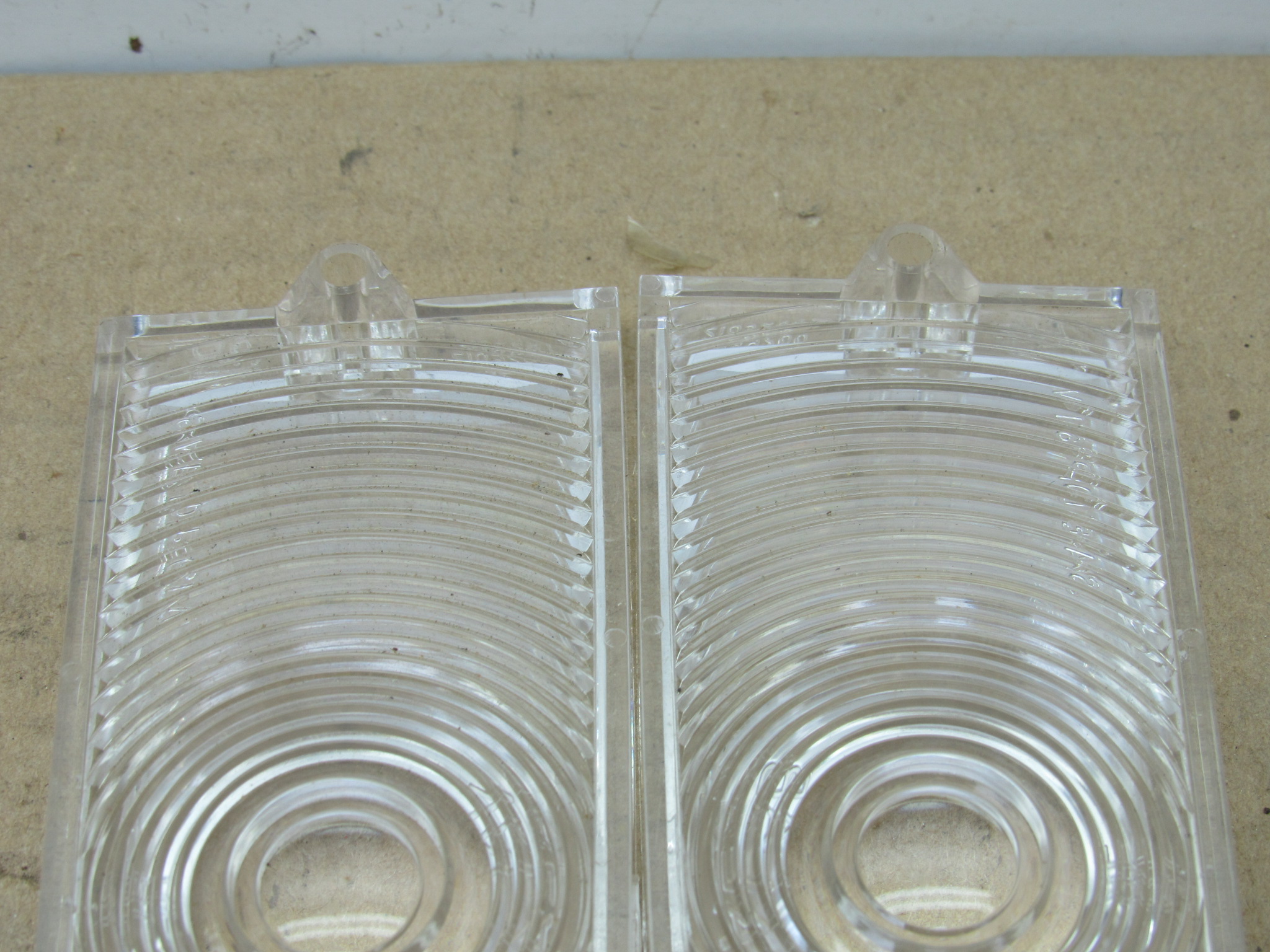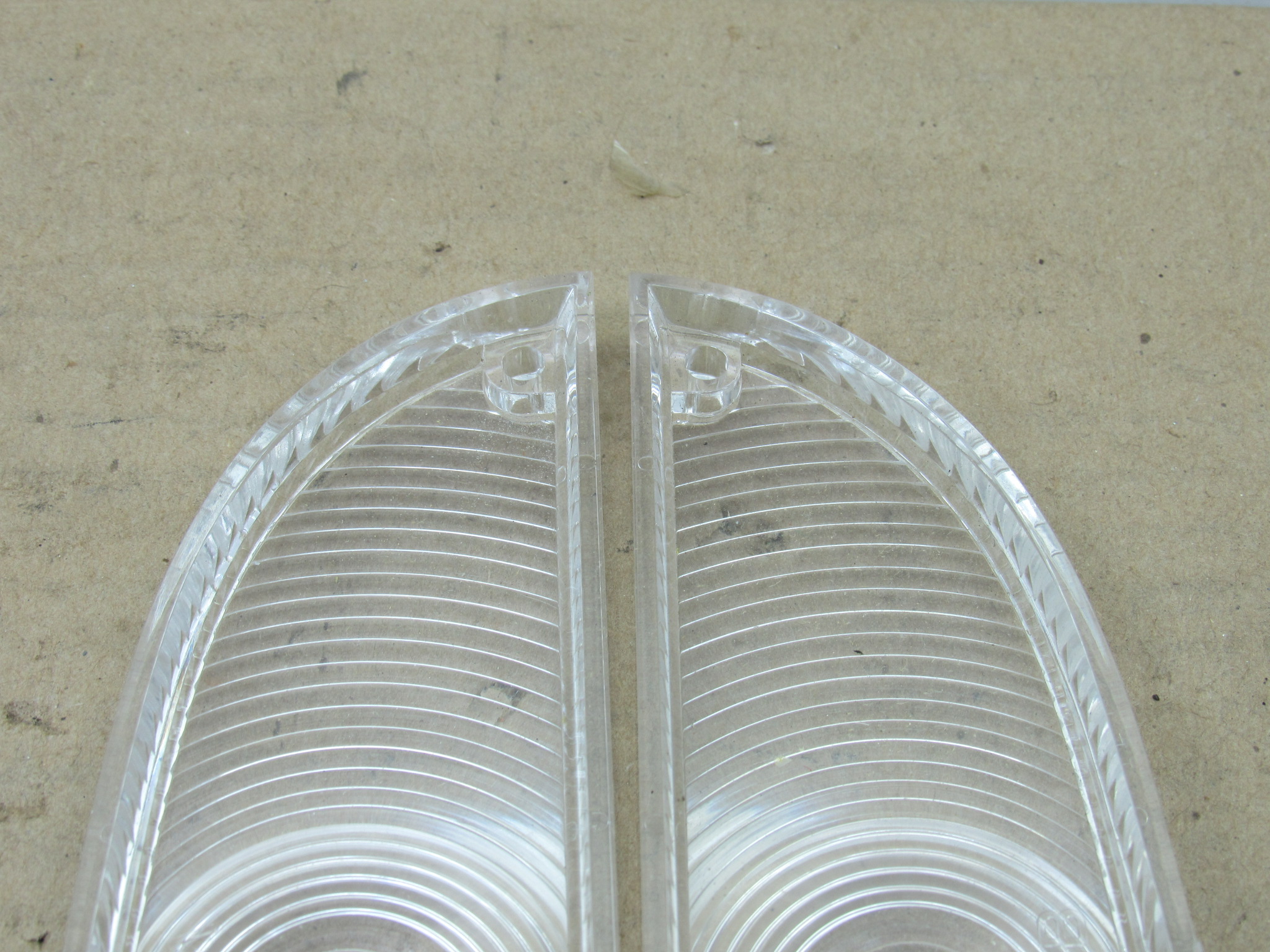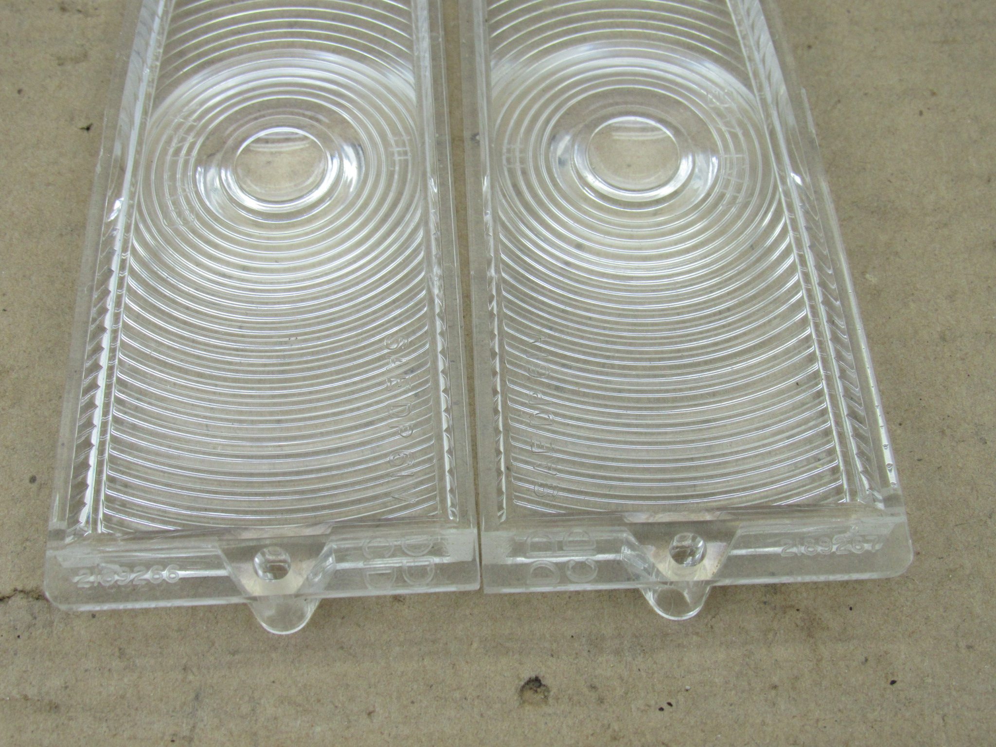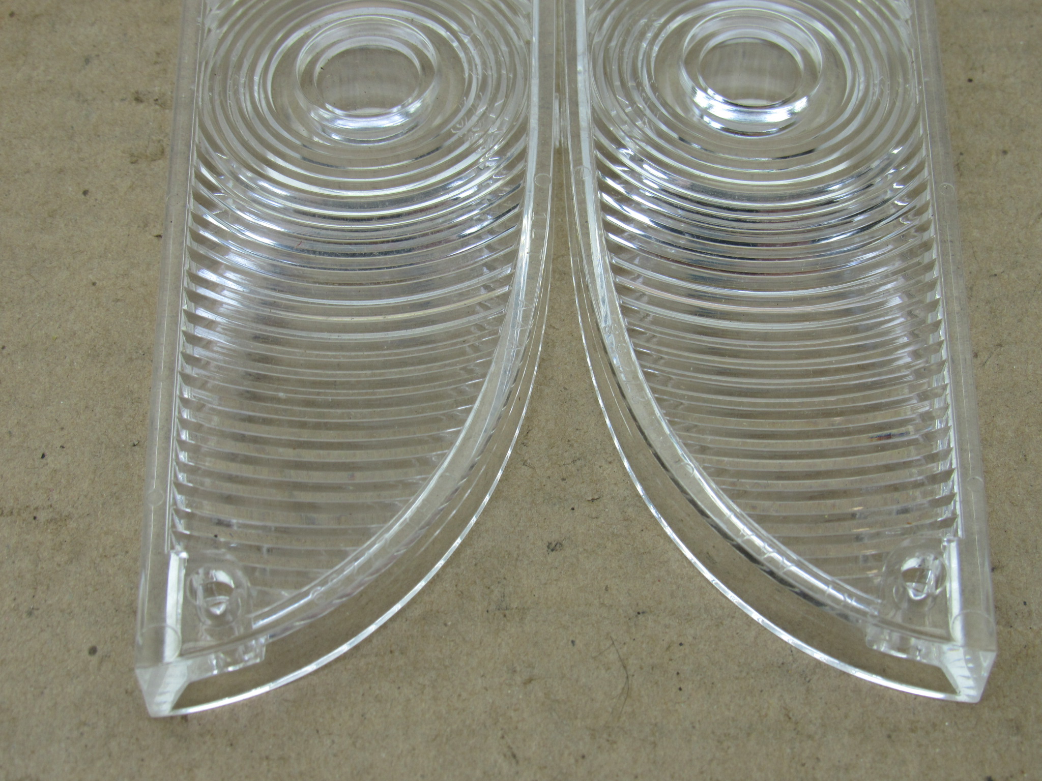 Fits 1961-62 Plymouth Valiant V100, V200, 1962 Signet 200, 1962 B body Plymouth Savoy, Belvedere, Fury, Sport models. This is the front park lamp lens and gasket package, it includes 1 left, and 1 right side clear front park lamp lens, and 2 gaskets. The Chrysler parts crash catalog shows these part numbers will also fit the 1960 models as well, however the lens pattern may vary slightly. The lenses are in very good condition, no chips or damage. 8-50-335.