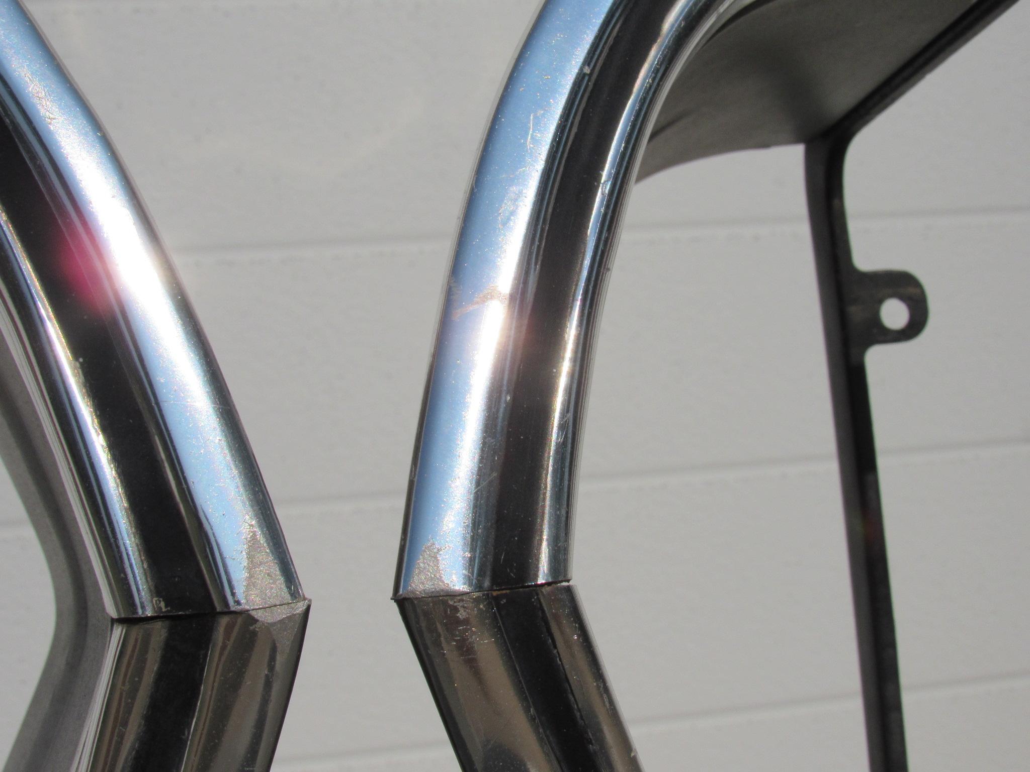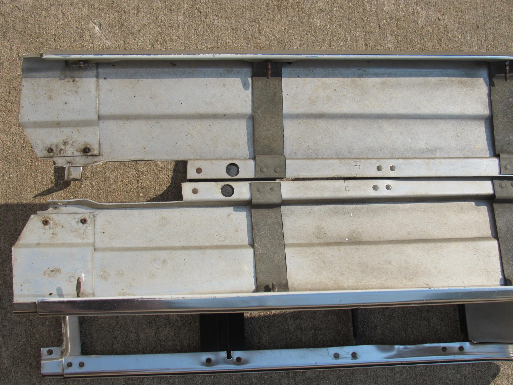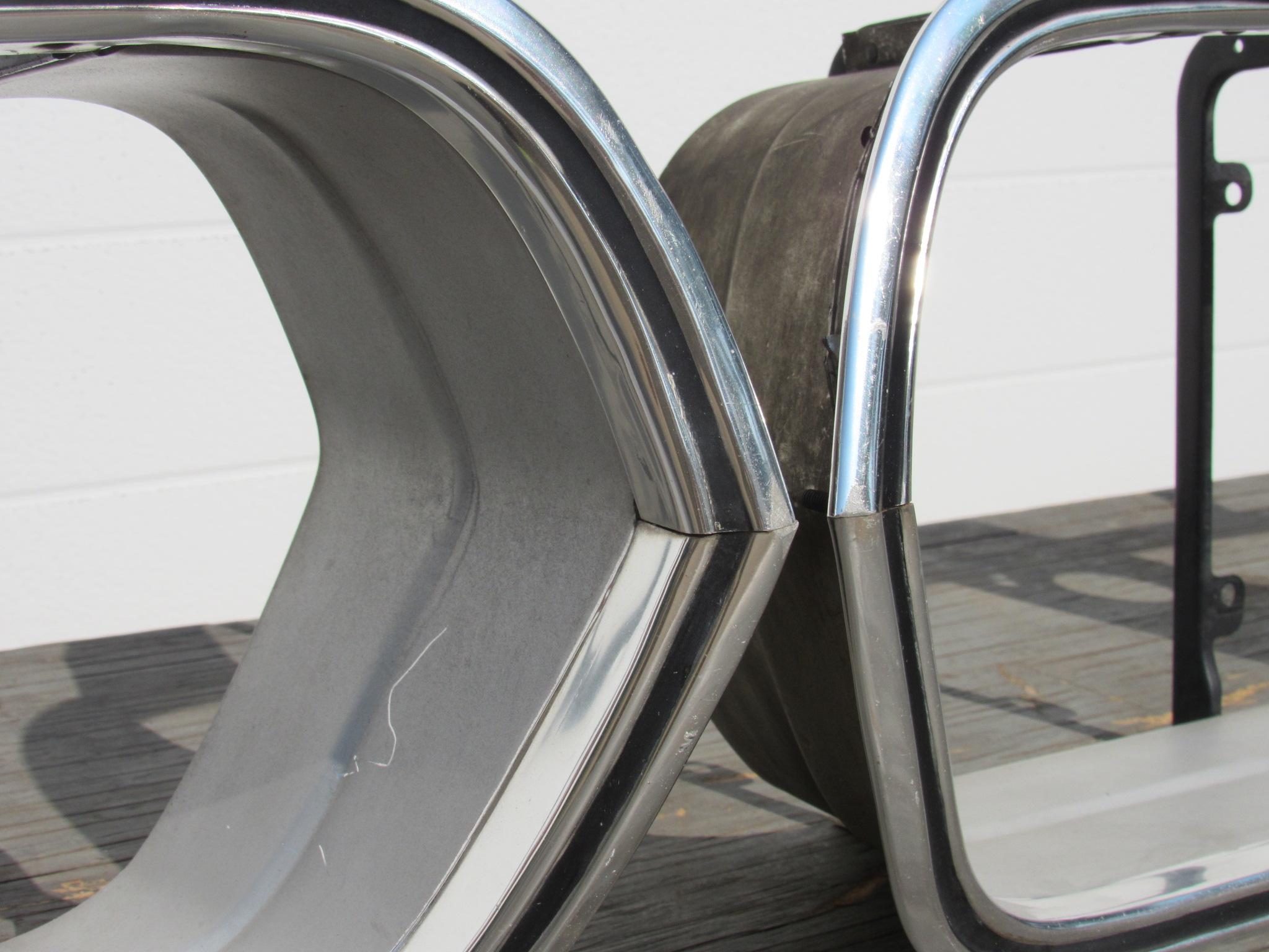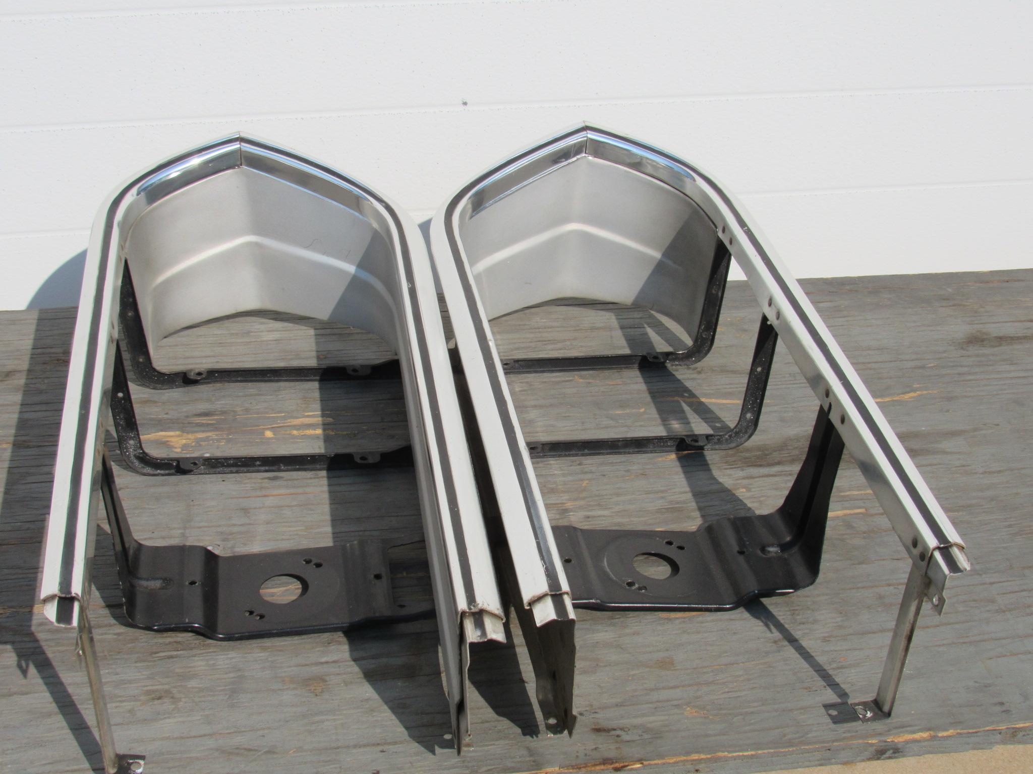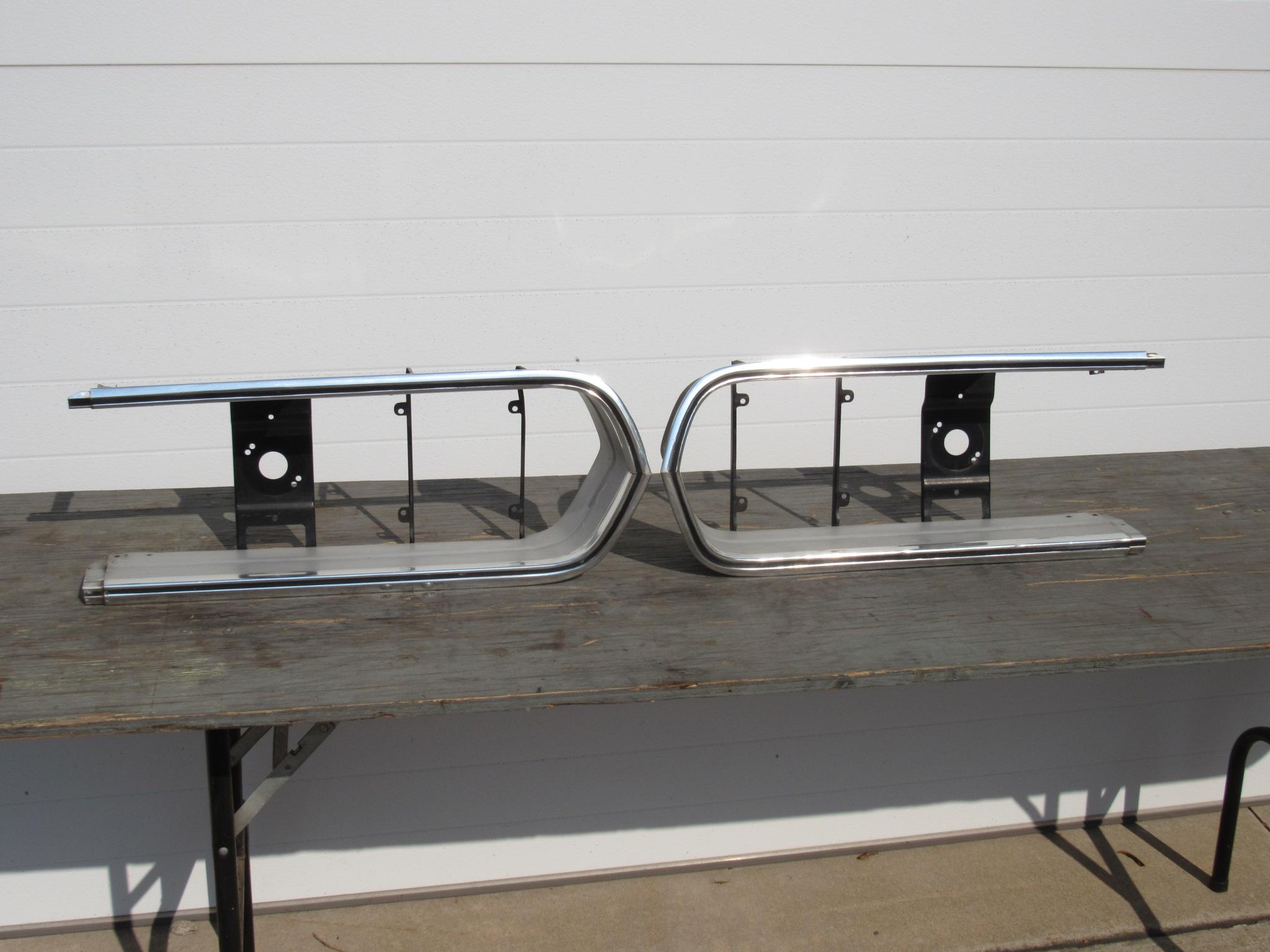 Fits 1967 A body Plymouth Barracuda, ‘Cuda 383, Formula S models. This is a pair, 1 left and 1 right side outer radiator grille assemblies, these are used original items that are in above average condition. The outer aluminum anodized with black painted trim area has a few minor scratches and worn sections, but overall very respectable. The plating is not badly pitted or beat from road debris. They have argent silver painted inner section, with black vertical reinforcement bars. The right side bezel has all of the threaded rear mounting studs except for one, it has been broken off, and 1 has some of the threads smoothed from removal process. The left side bezel has all the studs but 3 have some thread damaged from removing them from the header panel. They each have 3 metal inner mounting brackets for attaching the center bezels. Overall a very nice used original pair. 7-16-36.