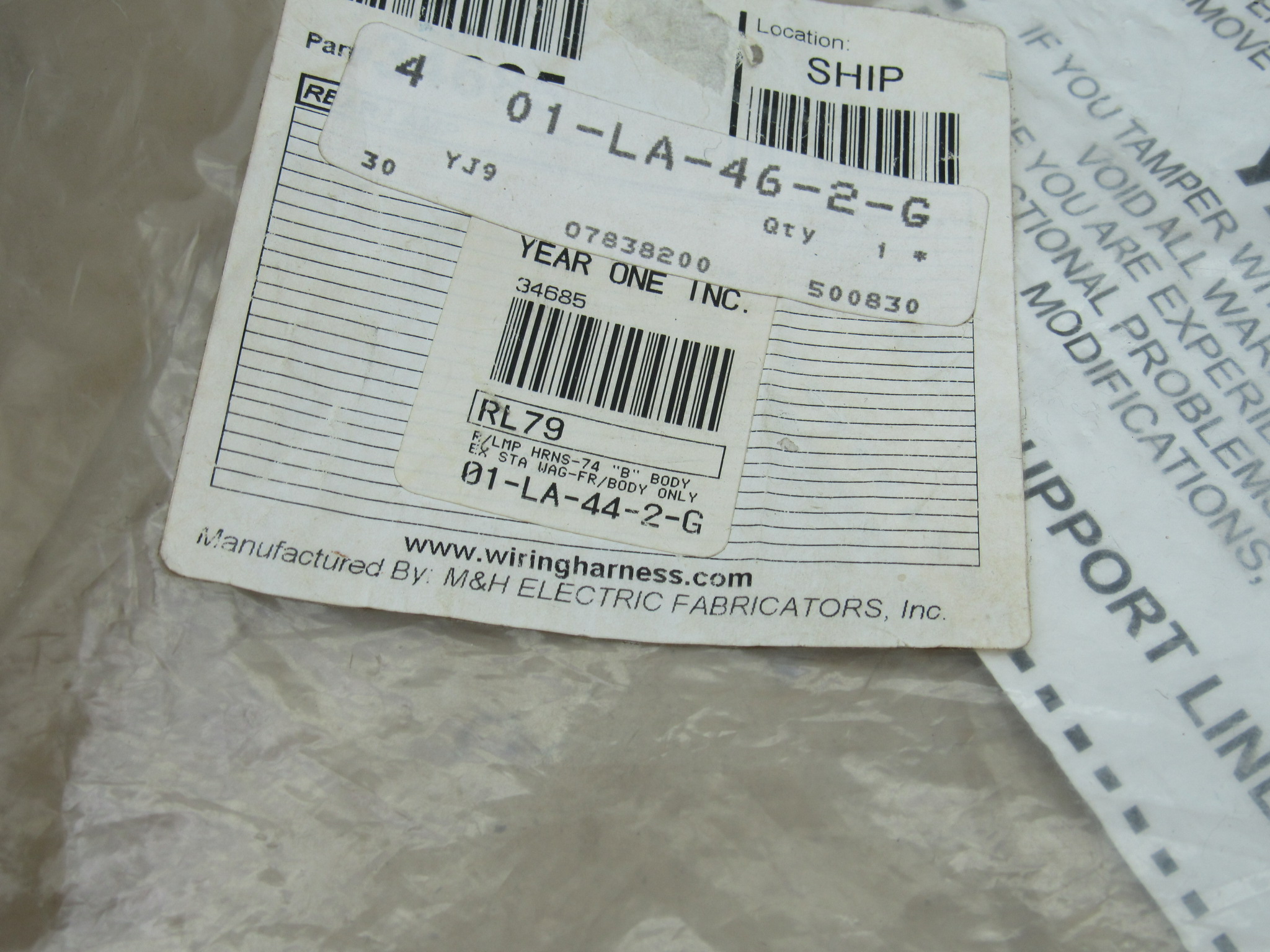 Fits 1974 B body Dodge Charger, SE, Plymouth Satellite, Sebring, Road Runner models. This is the rear tail lamp / light harness, it plugs into the lower left side dash harness located inside the kick panel and runs back to the rear of the vehicle and plugs into the left tail lamp. Includes the wiring, with front and rear insulator / connector, it has 6 wires, and includes the ground wire eyelet, fuel tank sending unit, and license plate lamp connector, with left side marker socket. This is a new reproduction harness, originally sold through Year One Inc, manufactured by M & H Electric Fabricators Inc. Part# RL79 / 34685. New condition, no damage. It is approx. 137″ long.