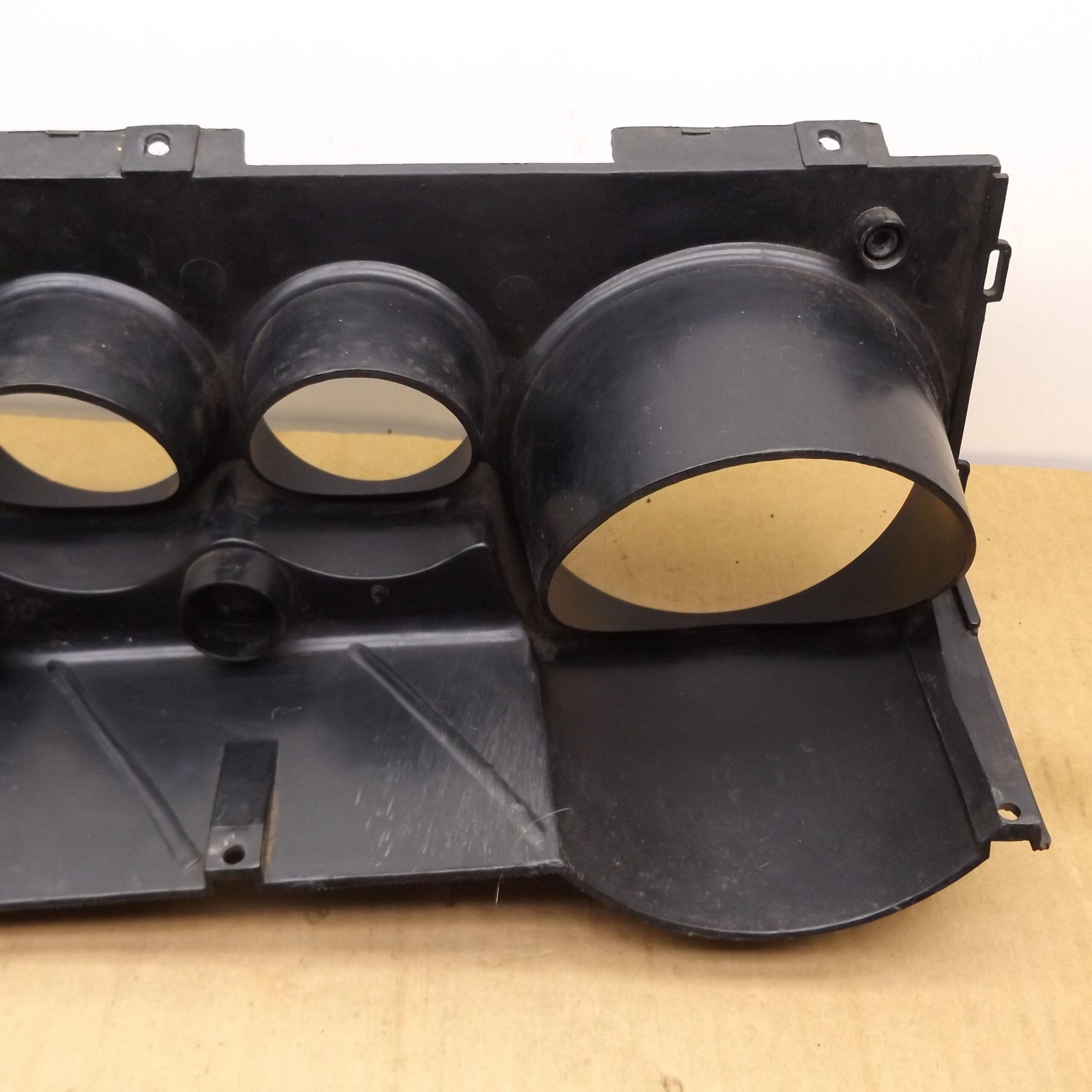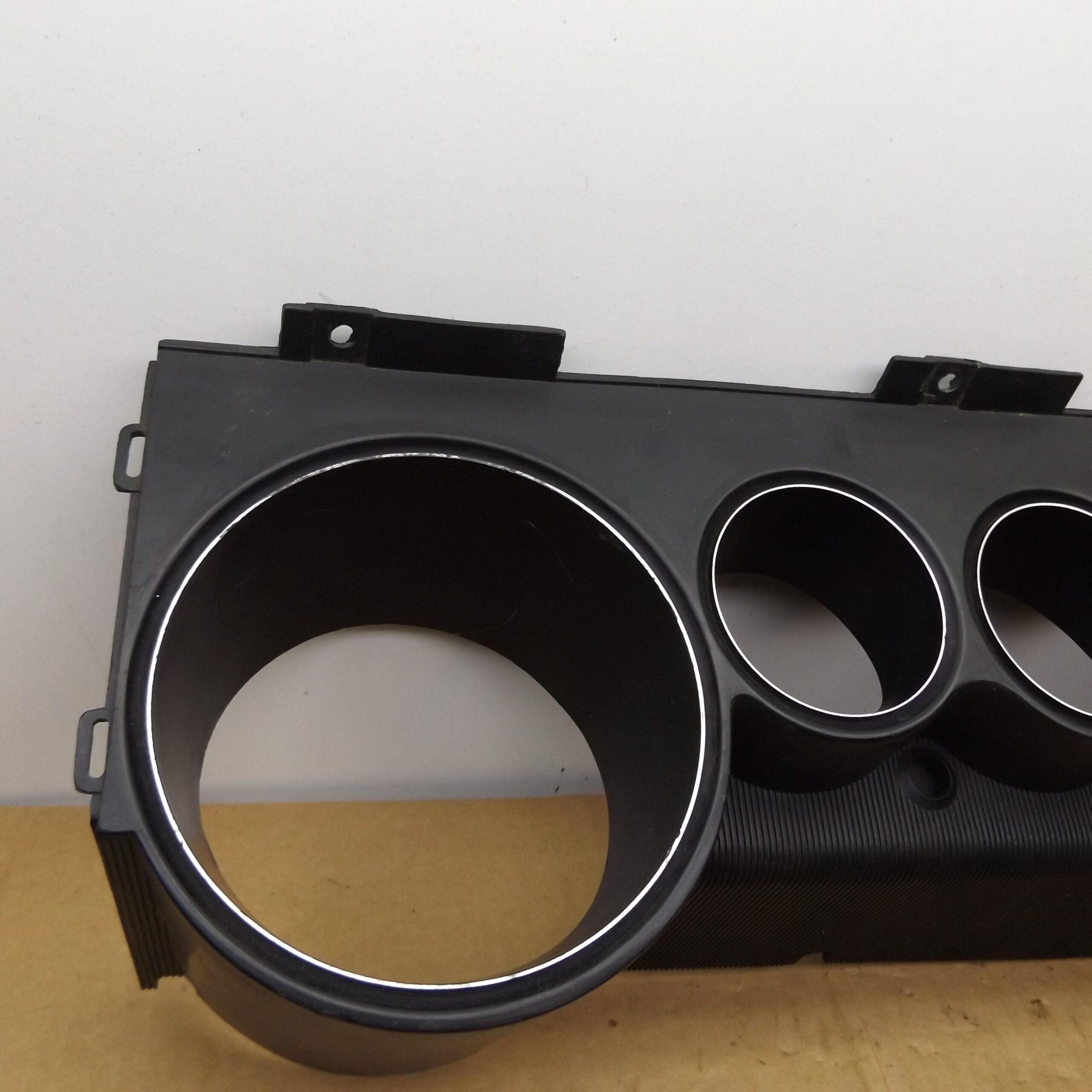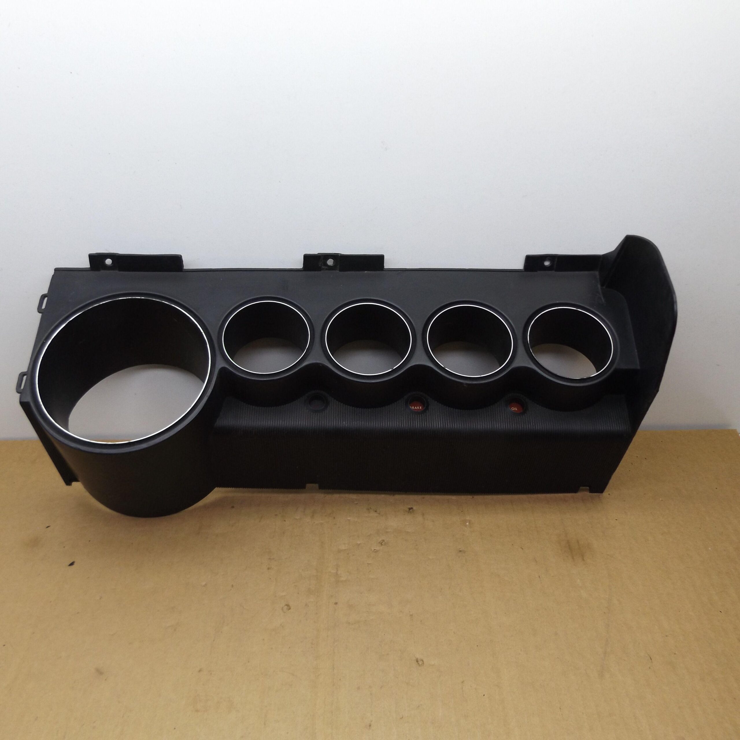 Fits 1970 E body Dodge Challenger. This is the black plastic speedometer and instrument cluster bezel. It mounts over the gauge cluster. This is a used original item,it is in good condition. No cracks,and all the mounting tabs and holes are not broken. The bottom and top side do not have the usual warping from UV sun rays and hot interiors. This is one of the nicest used bezels you will find. It includes the 3 red indicator lenses;brake,oil,hi-beam. This is the finned unit,with the large speedo,and 3 small round gauges to the left,use on models with standard dash,not with rallye. This unit is an un-restored item. It has some minor scratches,but overall very nice. 8-37-90.