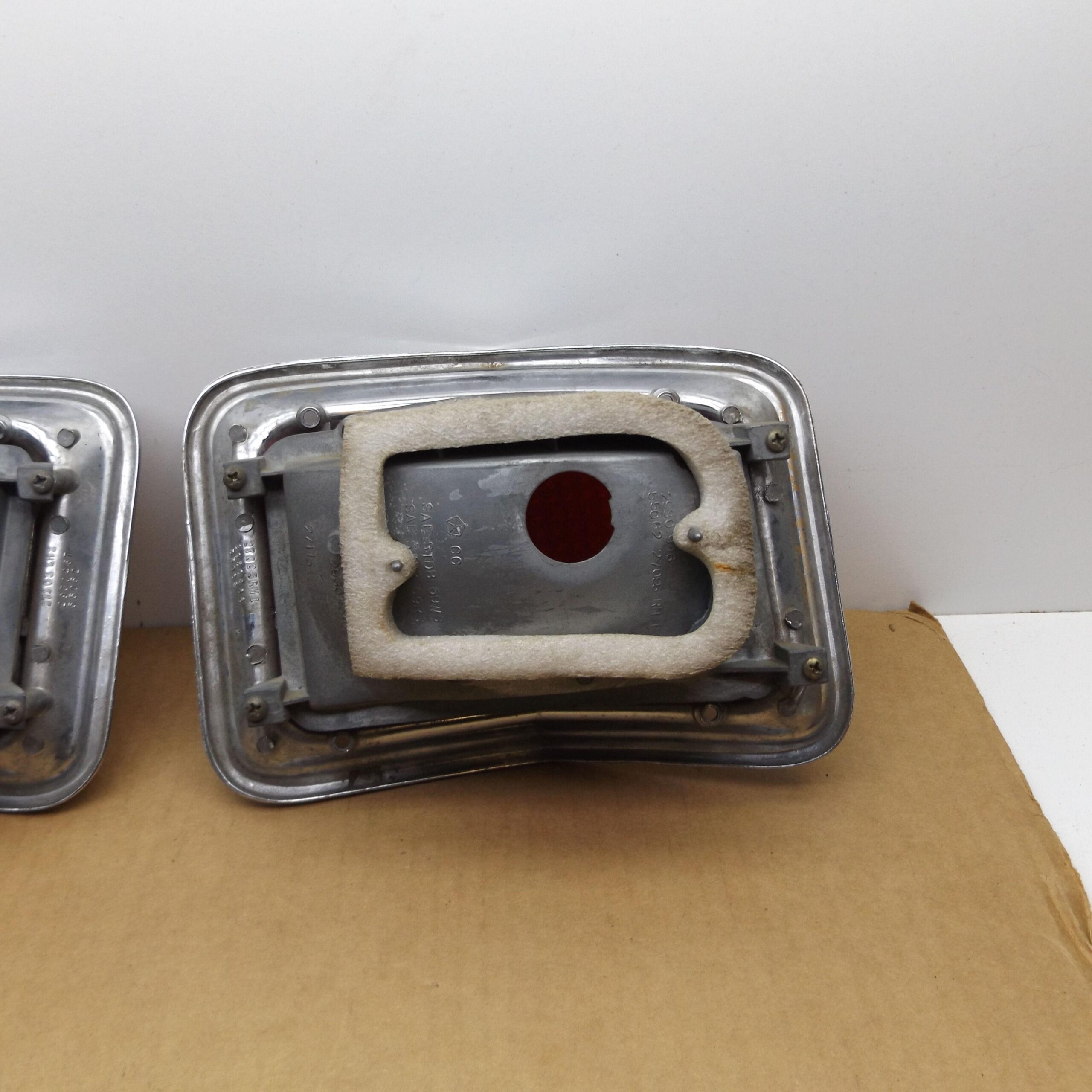 Fits 1969 B body Plymouth Belvedere, Satellite, Sport Satellite station wagon models. One pair; 1 left,and 1 right side complete used original tail lamps. This is an un-restored pair of lamps. Includes lamp housings, chrome bezels, red lenses, body gaskets. They are in good condition, very few pits, lenses and housings are not cracked. The argent silver coarse textured paint is still quite nice. The inner housings have nice plating and are in good condition. 8-55-7.