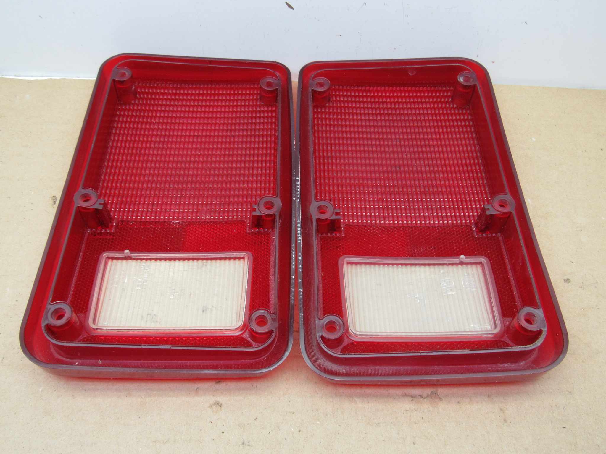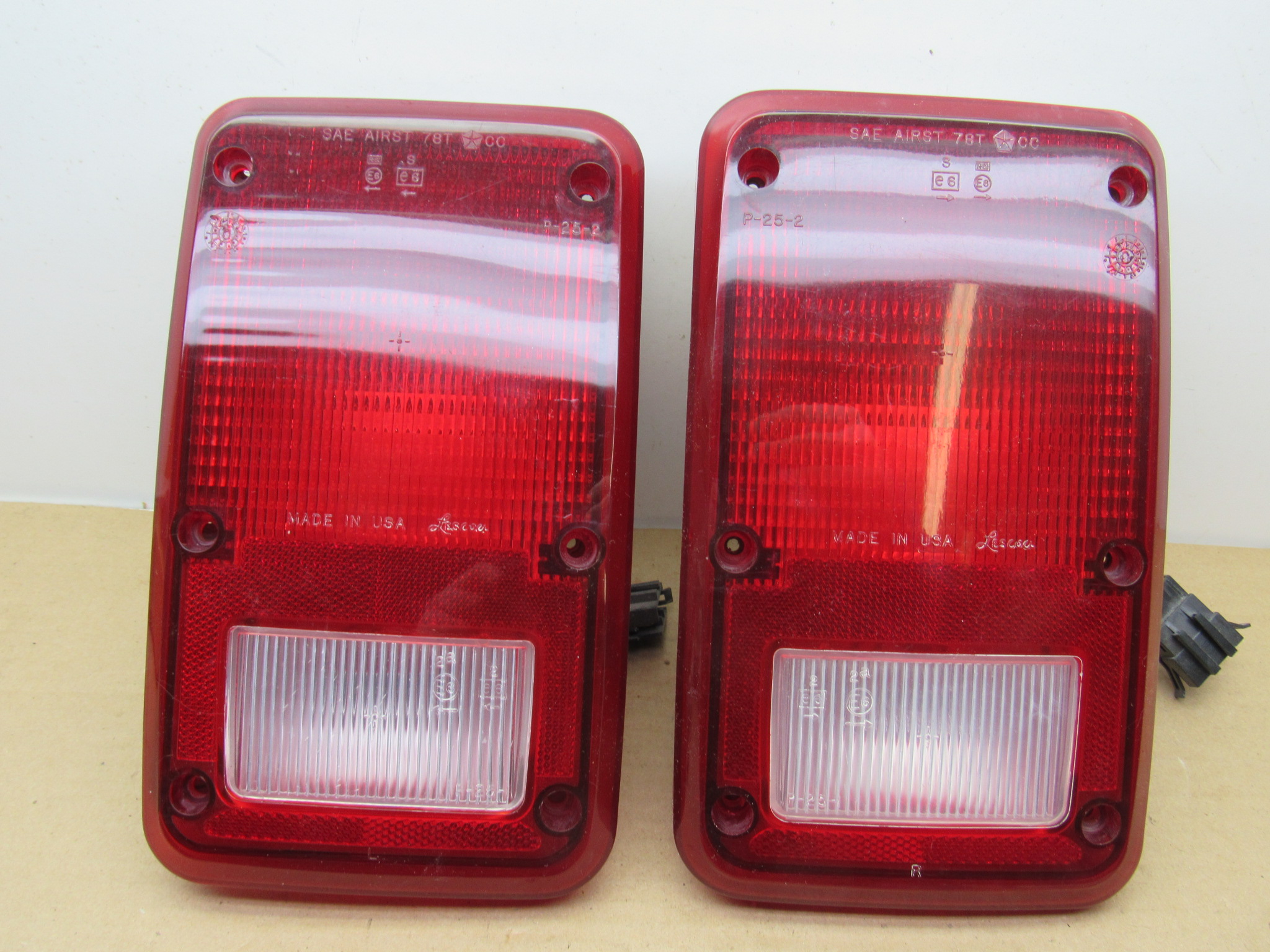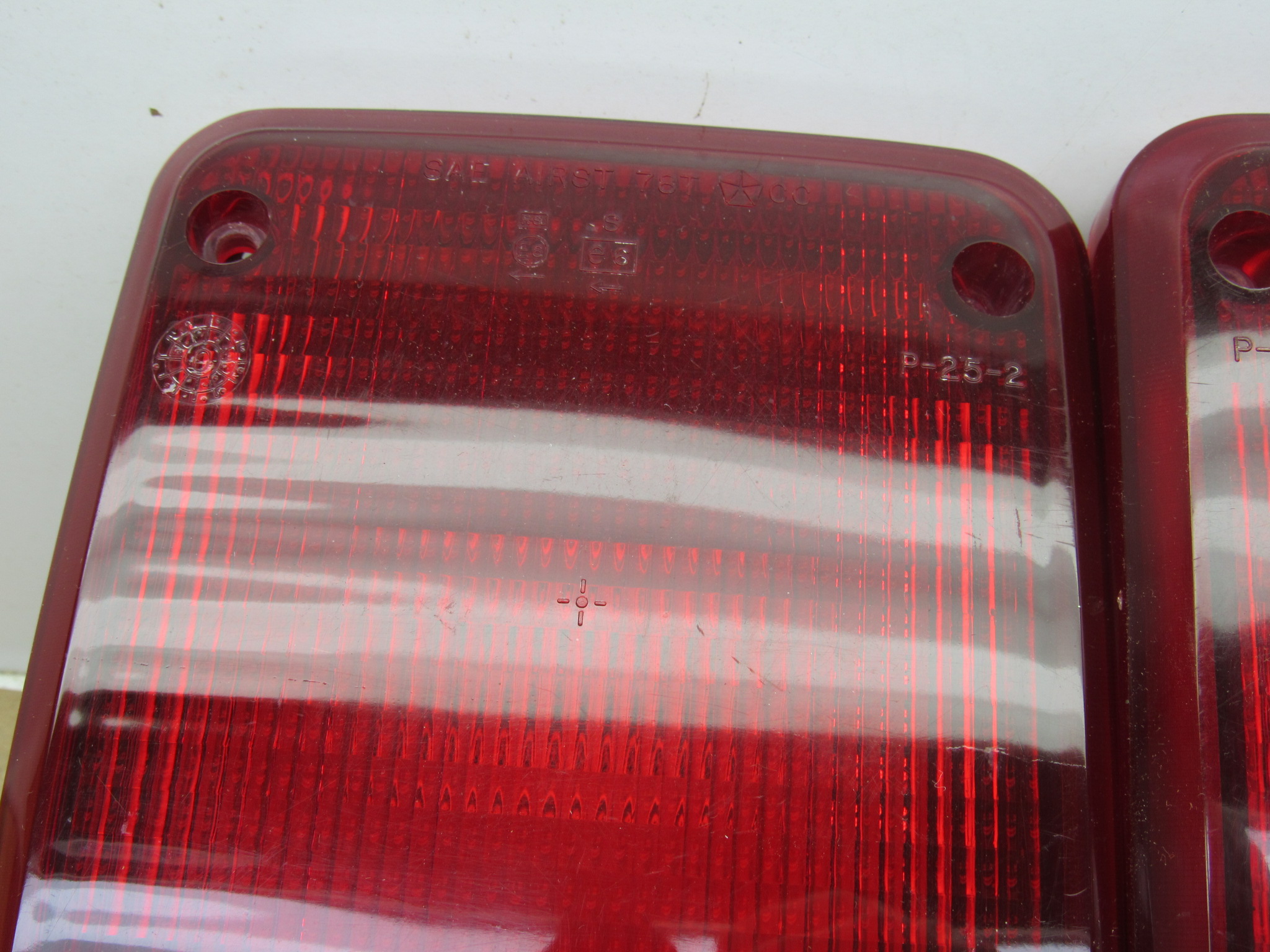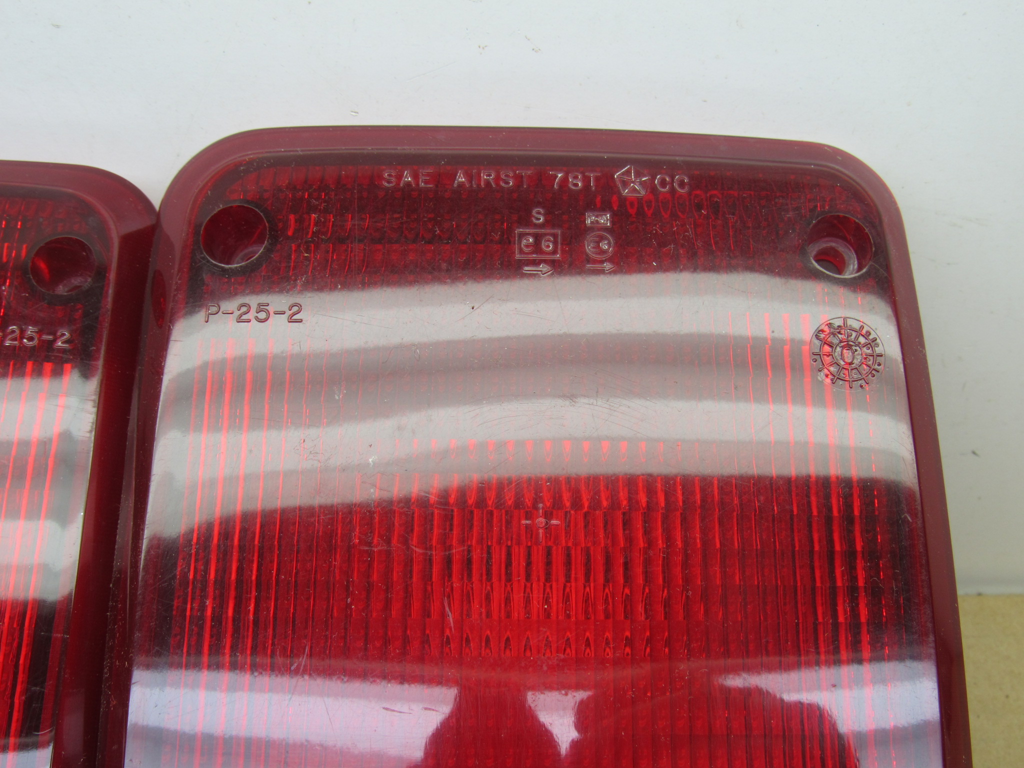 Fits 1978-89 Dodge, Plymouth van models P-B100-200-300. This is a pair of tail lamps, package includes 1 left, and 1 right side lens, 2 metal housings, both with partial wiring, 4 bulbs, 1 deflector, and 2 inner, 2 outer gaskets. The lenses will fit all years listed; 1978-89, however the housings have 3 different applications, for different model years. Part# 4293907 for 1978-82, Part# 4364489 for 1983-85, part# 4364489 for 1986-89 models. The housing included in this listing have # 4034171, and a wiring# 4362736. These are all used original items, i am not positive which year models these are correct for, please check your housing stamping numbers to verify. They have the newer type wire insulators / connectors more correct for the 1983-85, 1986-89 style. The sockets and wiring is in good working condition, they all light up nicely, and the housing are very clean, no rust. 8-8100-1.