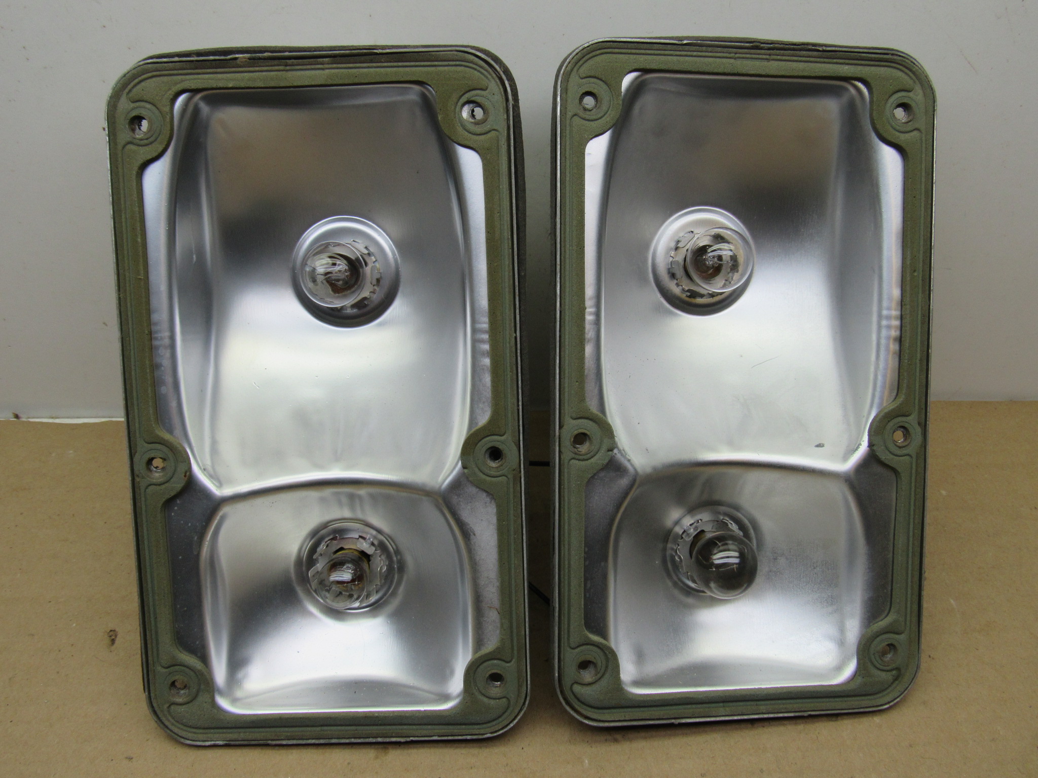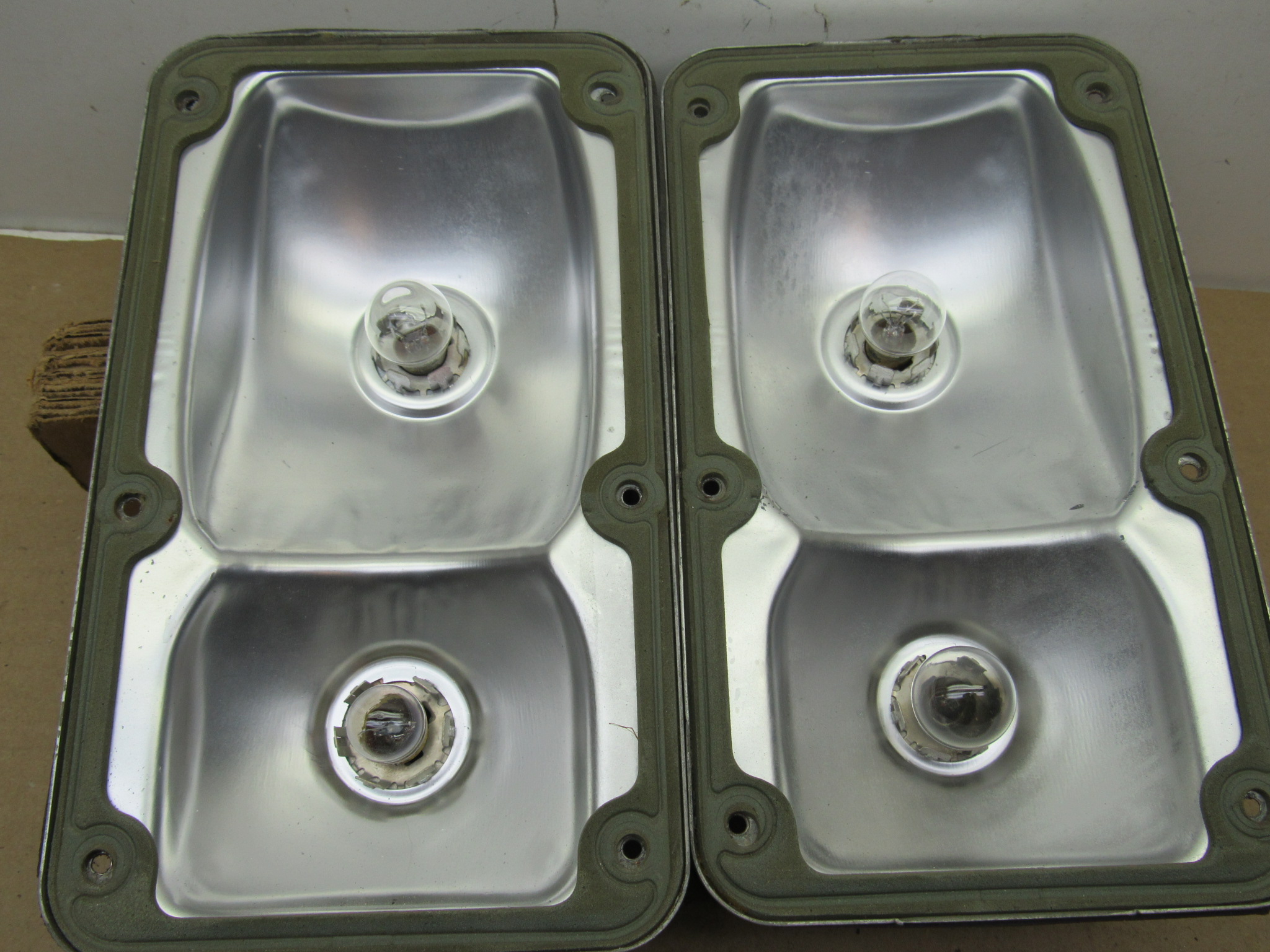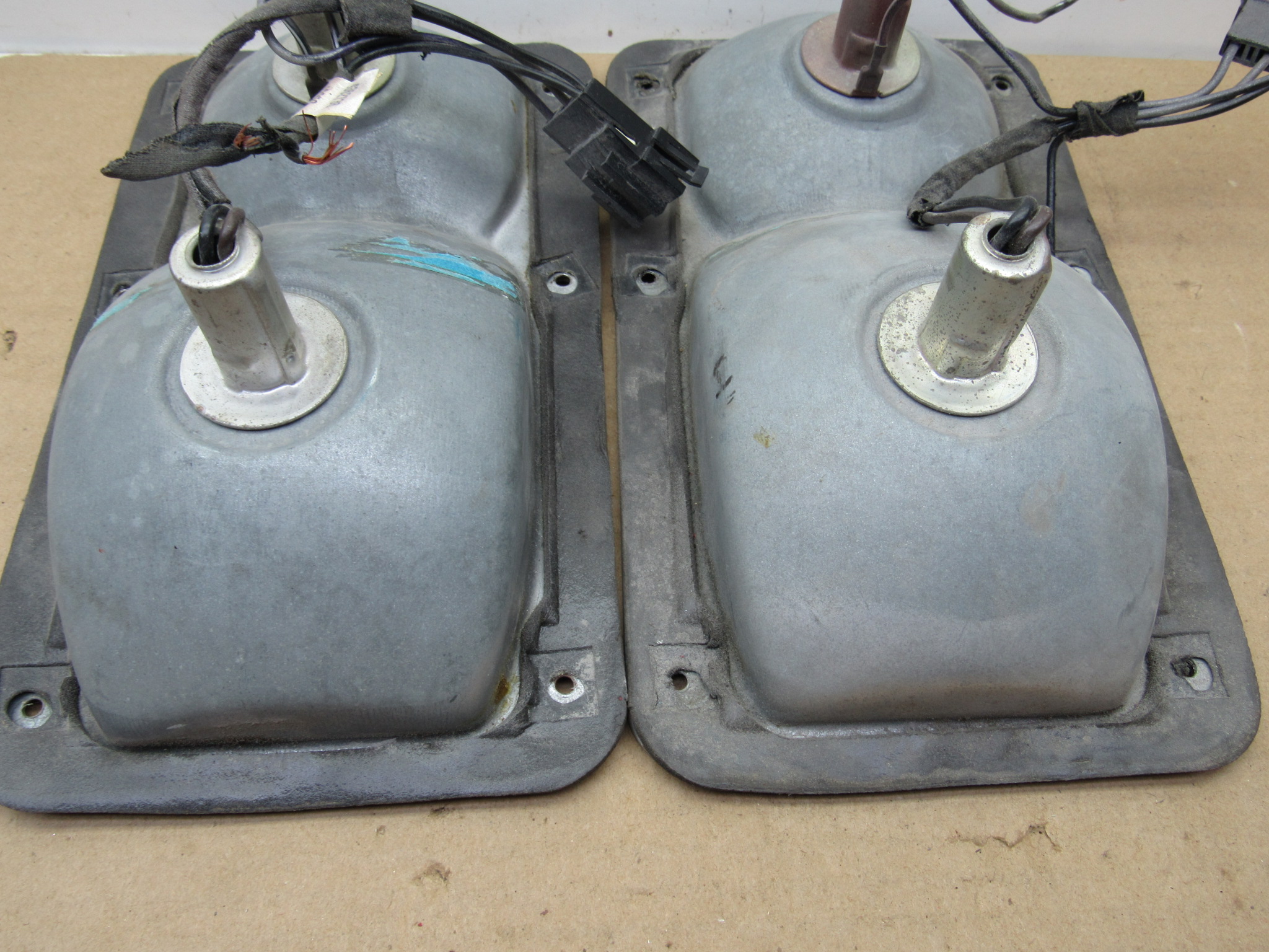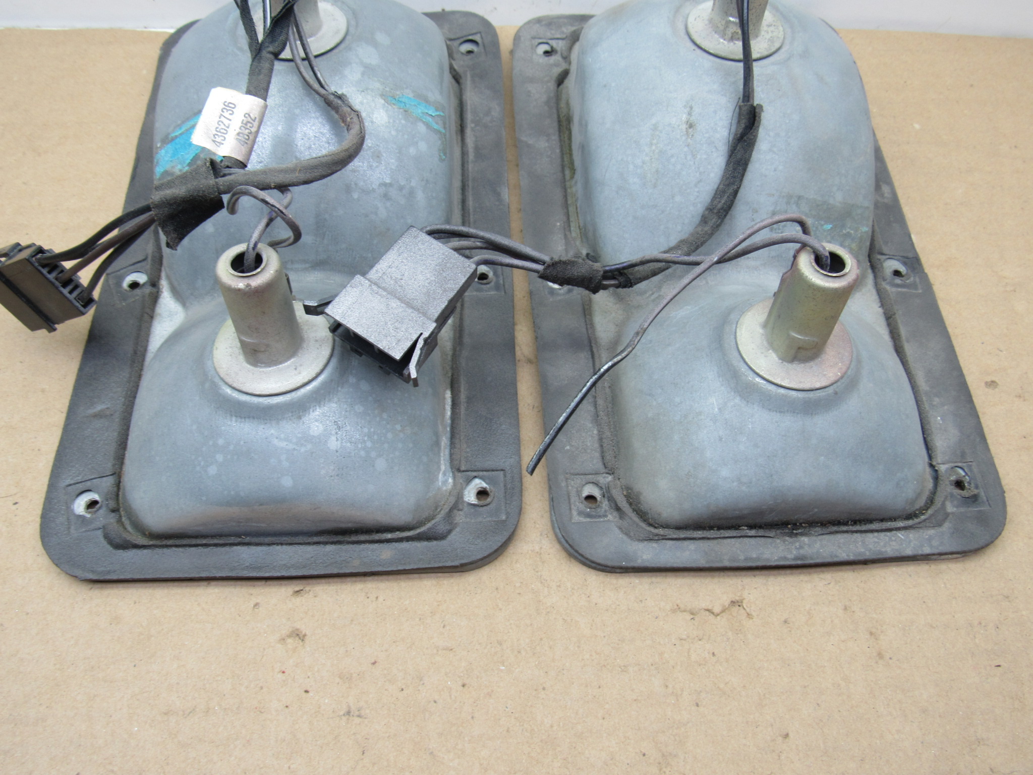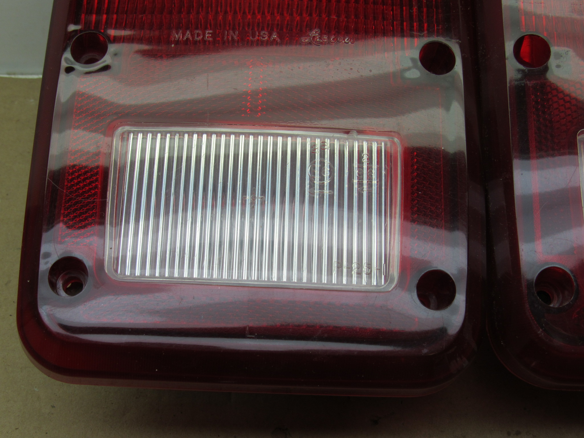 Fits 1978-89 Dodge, Plymouth van models P-B100-200-300. This is a pair of tail lamps, package includes 1 left, and 1 right side lens, 2 metal housings, both with partial wiring, 4 bulbs, 1 deflector, and 2 inner, 2 outer gaskets. The lenses will fit all years listed; 1978-89, however the housings have 3 different applications, for different model years. Part# 4293907 for 1978-82, Part# 4364489 for 1983-85, part# 4364489 for 1986-89 models. The housing included in this listing have # 4034171, and a wiring# 4362736. These are all used original items, i am not positive which year models these are correct for, please check your housing stamping numbers to verify. They have the newer type wire insulators / connectors more correct for the 1983-85, 1986-89 style. The sockets and wiring is in good working condition, they all light up nicely, and the housing are very clean, no rust. 8-8100-1.