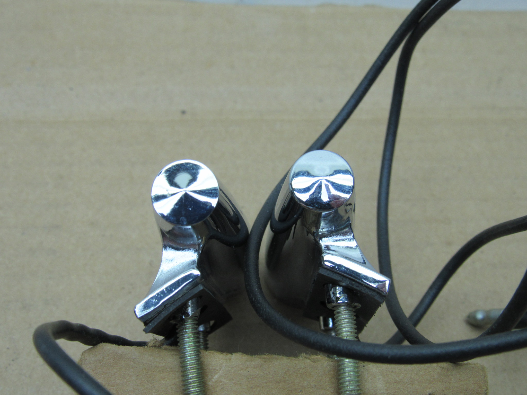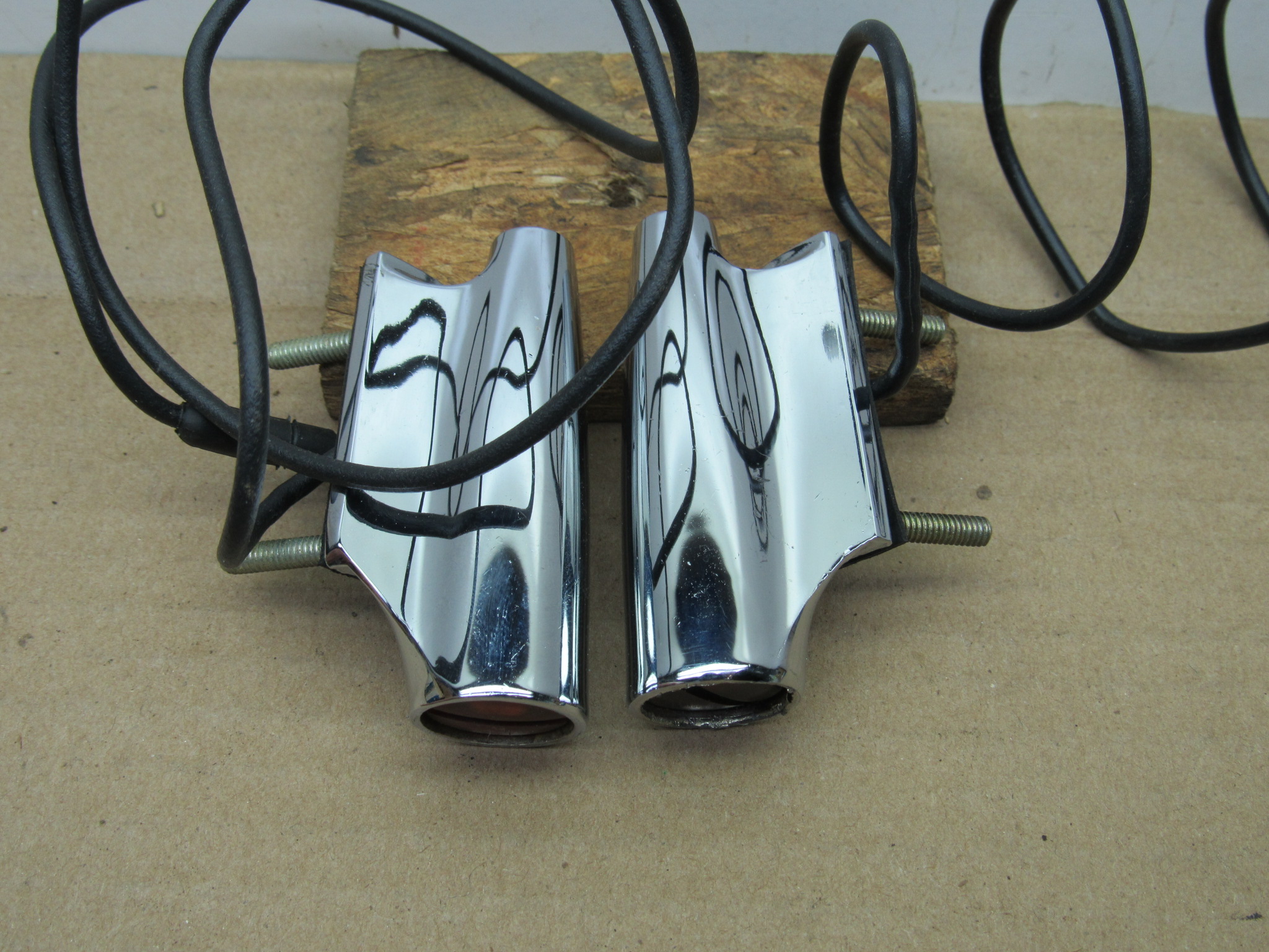 Fits 1968 A body Plymouth Valiant Signet, 1968-69 B body Plymouth Sport Satellite, GTX, 1969 Road Runner, 1968 C body Plymouth Fury III, Sport Fury, VIP, Sport Suburban station wagon models. This is a pair, 1 left, and 1 right side front fender mounted turn signal indicator lamp. Good condition, the chrome is not pitted, 2 threaded mounting studs with slotted type amber lens, 2 body gaskets, wiring harness and bulbs. Tested and in good working condition. The black power wire is 28″ long. This will also fit the 1967 Plymouth models, however the lens is different, the 1967 models used a smooth lens without the slot. 8-50-175.